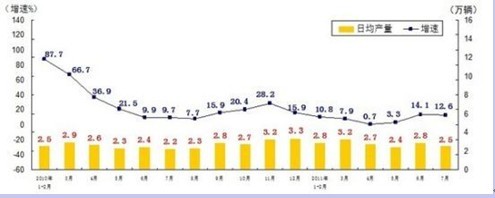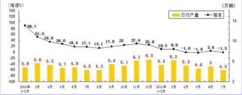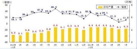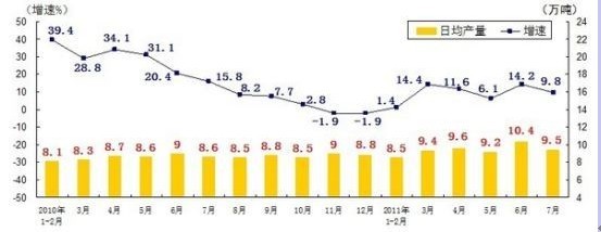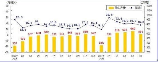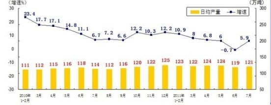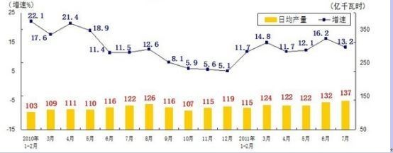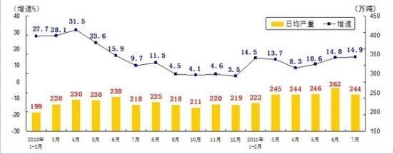 分產品看,7月份,468種產品中有381種產品同比增長。其中,發電量4252億千瓦時,日平均發電量137億千瓦時,增長13.2%;鋼材(4899,15.00,0.31%)7572萬噸,日平均產量244萬噸,增長14.9%;水泥18308萬噸,日平均產量591萬噸,增長16.8%;原油加工量3749萬噸,日平均產量121萬噸,增長5.9%;十種有色金屬293萬噸,日平均產量9.5萬噸,增長9.8%;乙烯130萬噸,日平均產量4.2萬噸,增長11.5%;汽車131.8萬輛,日平均產量4.3萬輛,下降1.3%;轎車77.7萬輛,日平均產量2.5萬輛,增長12.6%。