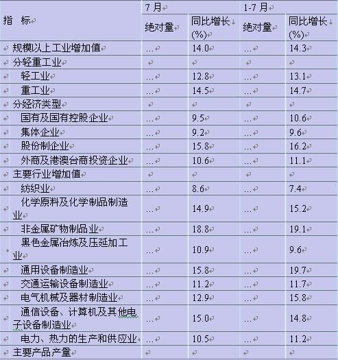 2011年7月份,規模以上工業增加值同比增長14.0%,比6月份回落1.1個百分點。1-7月份,規模以上工業增加值同比增長14.3%,增速與1-6月份持平。從環比看,7月份,規模以上工業增加值增長0.9%。