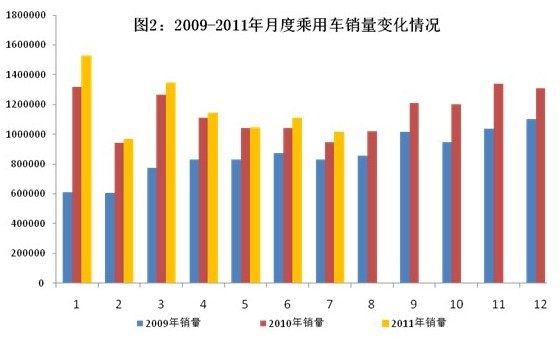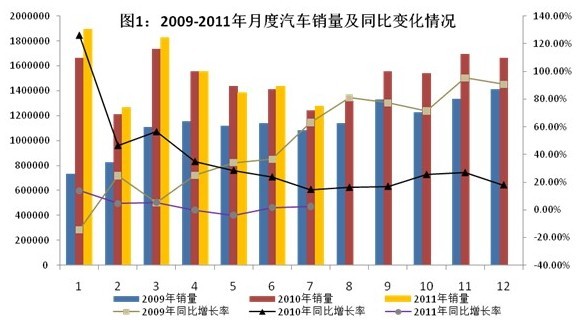 2011年1-7月,我國汽車產銷量雙雙超過1000萬輛,同比分別增長2.33%和3.22%。7月,汽車產銷市場同比保持小幅增長。