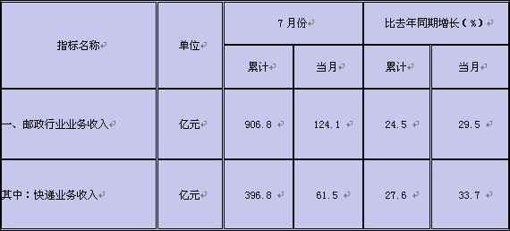 7月份,全行業(yè)業(yè)務(wù)收入完成124.1億元,同比增長29.5%;業(yè)務(wù)總量完成129億元,同比增長23.3%。