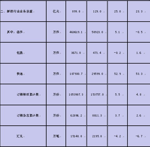 2.郵政行業(yè)業(yè)務(wù)收入中未包括郵政儲(chǔ)蓄銀行直接營業(yè)收入。