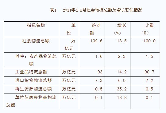 1-8月社會物流總額為102.6萬億元,按可比價格計算,同比增長13.5%,增幅比1-7月回落0.1個百分點,比去年同期回落3.7個百分點,回落幅度繼續收窄。總體來看,社會物流總額仍然保持較快增長態勢,且增勢平穩。