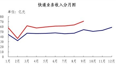 9月份,快遞業務量完成3.2億件,同比增長50.7%;業務收入完成71億元,同比增長30.6%。