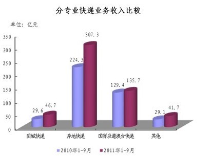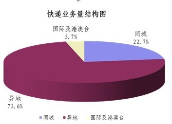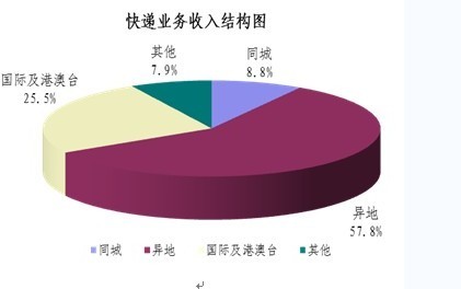 1-9月,同城、異地、國際及港澳臺快遞業務收入分別占全部快遞收入的8.8%、57.8%和25.5%;業務量分別占全部快遞業務量的22.7%、73.6%和3.7%。同城快遞業務收入的比重上升1.6個百分點,異地快遞業務收入的比重上升3.4個百分點,國際及港澳臺業務收入的比重下降了5.9個百分點。