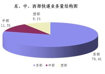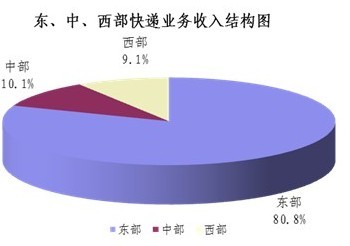 1-9月,東、中、西部地區快遞業務收入的比重分別為80.8%、10.1%和9.1%,業務量比重分別為79.4%、11.5%和9.1%。與去年同期相比,東部地區快遞業務收入比重下降了0.5個百分點,快遞業務量比重上升了0.2個百分點;中部地區快遞業務收入比重上升了0.3個百分點,快遞業務量比重下降了0.2個百分點;西部地區快遞業務收入比重上升了0.2個百分點,快遞業務量比重與去年同期持平。