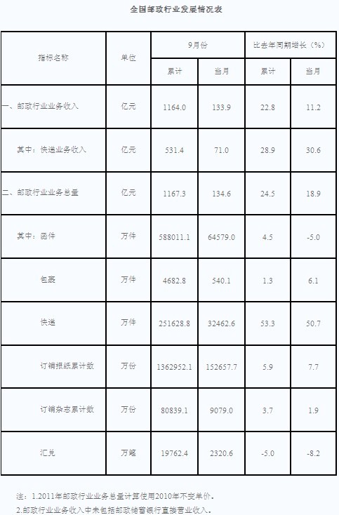 9月份,全行業業務收入完成133.9億元,同比增長11.2%;業務總量完成134.6億元,同比增長18.9%。
