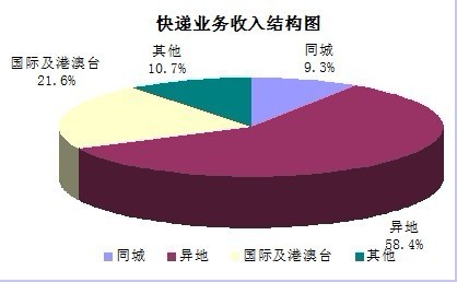 1月,同城、異地、國際及港澳臺快遞業務收入分別占全部快遞收入的9.3%、58.4%和21.6%;業務量分別占全部快遞業務量的23.4%、73.3%和3.3%。同城快遞業務收入的比重上升1.9個百分點,異地快遞業務收入的比重下降0.9個百分點,國際及港澳臺業務收入的比重下降了6.6個百分點。