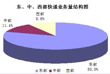 1月,東、中、西部地區快遞業務收入的比重分別為80.7%、10.1%和9.2%,業務量比重分別為80.0%、11.4%和8.6%。與去年同期相比,東部地區快遞業務收入比重上升0.5個百分點,快遞業務量比重上升了1.6個百分點;中部地區快遞業務收入比重下降了0.3個百分點,快遞業務量比重下降了1個百分點;西部地區快遞業務收入比重下降了0.2個百分點,快遞業務量比重下降了0.6個百分點。