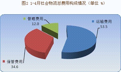1-4月社會(huì)物流總費(fèi)用2.6萬億元,同比增長11.8%,增幅比一季度回落0.4個(gè)百分點(diǎn),比去年同期回落5.9個(gè)百分點(diǎn)。其中,運(yùn)輸費(fèi)用1.4萬億元,同比增長11.1%,增幅與一季度持平。受燃油價(jià)格上漲等影響,道路運(yùn)輸費(fèi)用增長突出,同比增長13.1%,增幅比一季度提高0.3個(gè)百分點(diǎn),比社會(huì)物流總費(fèi)用和運(yùn)輸費(fèi)用分別高1.3個(gè)和2個(gè)百分點(diǎn)。保管費(fèi)用0.9萬億元,同比增長12.3%,增幅比一季度回落0.7個(gè)百分點(diǎn)。其中,利息費(fèi)用同比增長14.1%,增幅比保管費(fèi)用高1.8個(gè)百分點(diǎn)。管理費(fèi)用0.3萬億元,同比增長13%,增幅比一季度回落1.7個(gè)百分點(diǎn)。