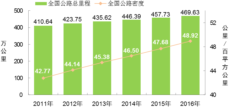 年末全國公路總里程469.63萬公里,比上年增加11.90萬公里。公路密度48.92公里/百平方公里,增加1.24公里/百平方公里。公路養(yǎng)護里程459.00萬公里,占公路總里程97.7%。