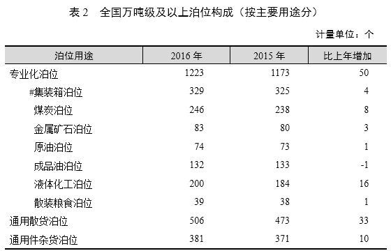 全國萬噸級及以上泊位中,專業(yè)化泊位1223個,比上年增加50個;通用散貨泊位506個,增加33個;通用件雜貨泊位381個,增加10個。