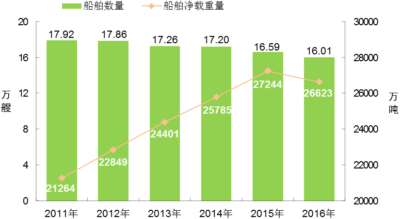 圖7 2011-2016年全國水上運輸船舶擁有量