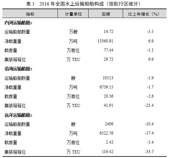 年末全國擁有水上運輸船舶16.01萬艘,比上年減少3.5%;凈載重量26622.71萬噸,減少2.3%;載客量100.21萬客位,減少1.5%;集裝箱箱位191.04萬標準箱,減少26.6%。