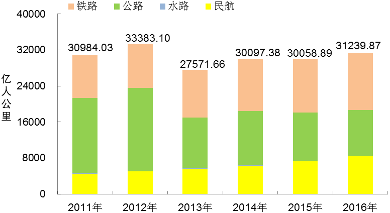 圖9 2011-2016年全社會旅客周轉(zhuǎn)量