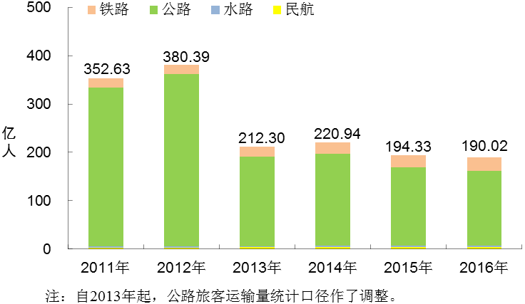 2016年,全社會完成營業(yè)性客運量190.02億人,比上年下降2.2%,旅客周轉(zhuǎn)量31239.87億人公里,增長3.9%,貨運量431.34億噸,增長5.2%,貨物周轉(zhuǎn)量182432.29億噸公里,增長5.0%。