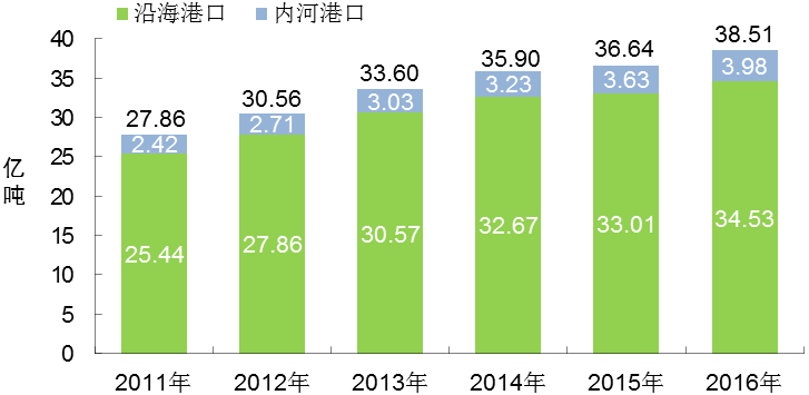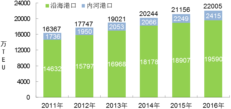 圖14 2011-2016年全國港口集裝箱吞吐量