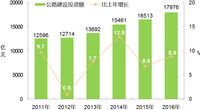 圖16 2011-2016年公路建設(shè)投資額及增長速度