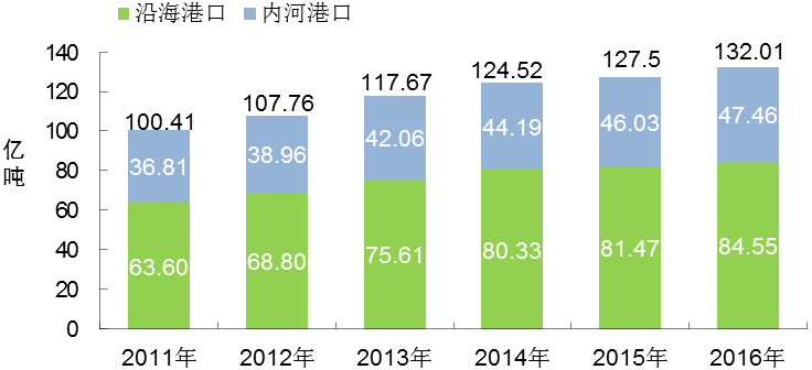 全國港口完成貨物吞吐量132.01億噸,比上年增長3.5%。其中,沿海港口完成84.55億噸,增長3.8%;內(nèi)河港口完成47.46億噸,增長3.1%。