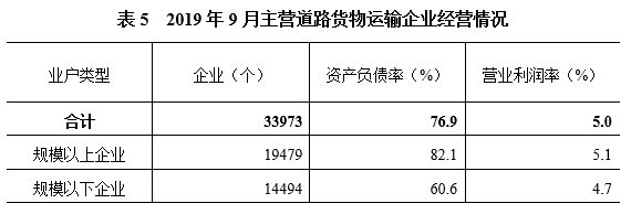 2019年9月主營(yíng)道路貨物運(yùn)輸業(yè)務(wù)的企業(yè)平均資產(chǎn)負(fù)債率為76.9%,營(yíng)業(yè)利潤(rùn)率為5.0%。個(gè)體經(jīng)營(yíng)戶平均營(yíng)業(yè)收入為2.44萬(wàn)元,燃油費(fèi)、通行費(fèi)、保險(xiǎn)費(fèi)、維修費(fèi)等支出為1.55萬(wàn)元。此外,還需承擔(dān)車(chē)輛折舊費(fèi)用、人工成本等。
