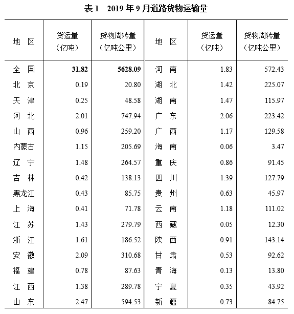 2019年9月,全國(guó)營(yíng)業(yè)性貨運(yùn)車(chē)輛完成貨運(yùn)量31.82億噸,貨物周轉(zhuǎn)量5628.09億噸公里,平均運(yùn)距為177公里。