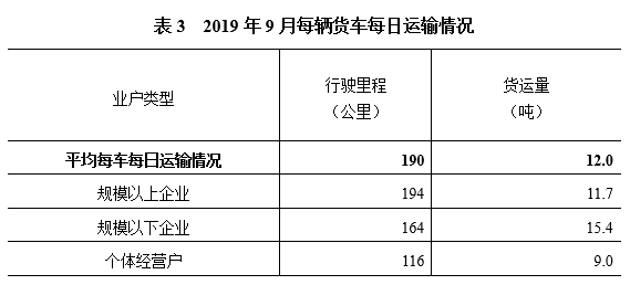2019年9月每輛貨車(chē)每日平均行駛190公里,運(yùn)輸貨物12.0噸。每噸貨物運(yùn)輸距離平均為177公里。
