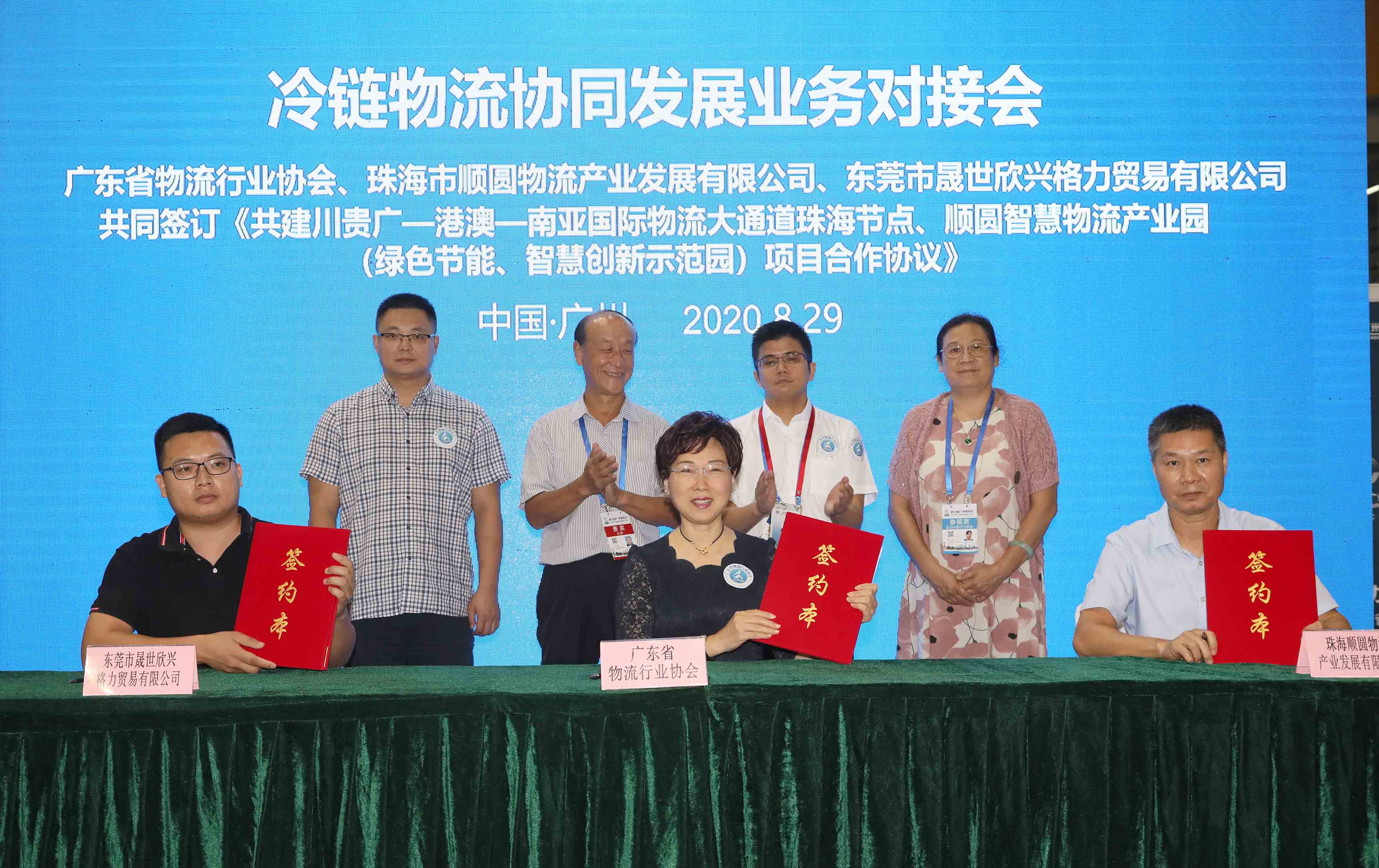 8月29日,在廣東省物流行業(yè)協(xié)會主辦的“2020廣州國際生鮮供應鏈及冷鏈技術裝備展覽會”上,協(xié)會物流研究院院長馬仁洪、副秘書長謝誠杰、東莞格力總經(jīng)理王文、廣州威俊汽車貿(mào)易有限公司總經(jīng)理杜立容和參會嘉賓的見證下,廣東省物流行業(yè)協(xié)會梁玉霞秘書長、東莞格力冷凍冷藏負責人劉戊烽、珠海市順圓物流產(chǎn)業(yè)發(fā)展有限公司董事長梁炳昌共同簽訂了《共建“川貴廣—港澳—南亞國際物流大通道”珠海節(jié)點、順圓智慧物流產(chǎn)業(yè)園(綠色節(jié)能、智慧創(chuàng)新示范)重點項目合作協(xié)議》,攜手建設節(jié)能型、智慧型、高效集約的先進冷鏈技術裝備綜合應用與示范的戰(zhàn)略樞紐節(jié)點。