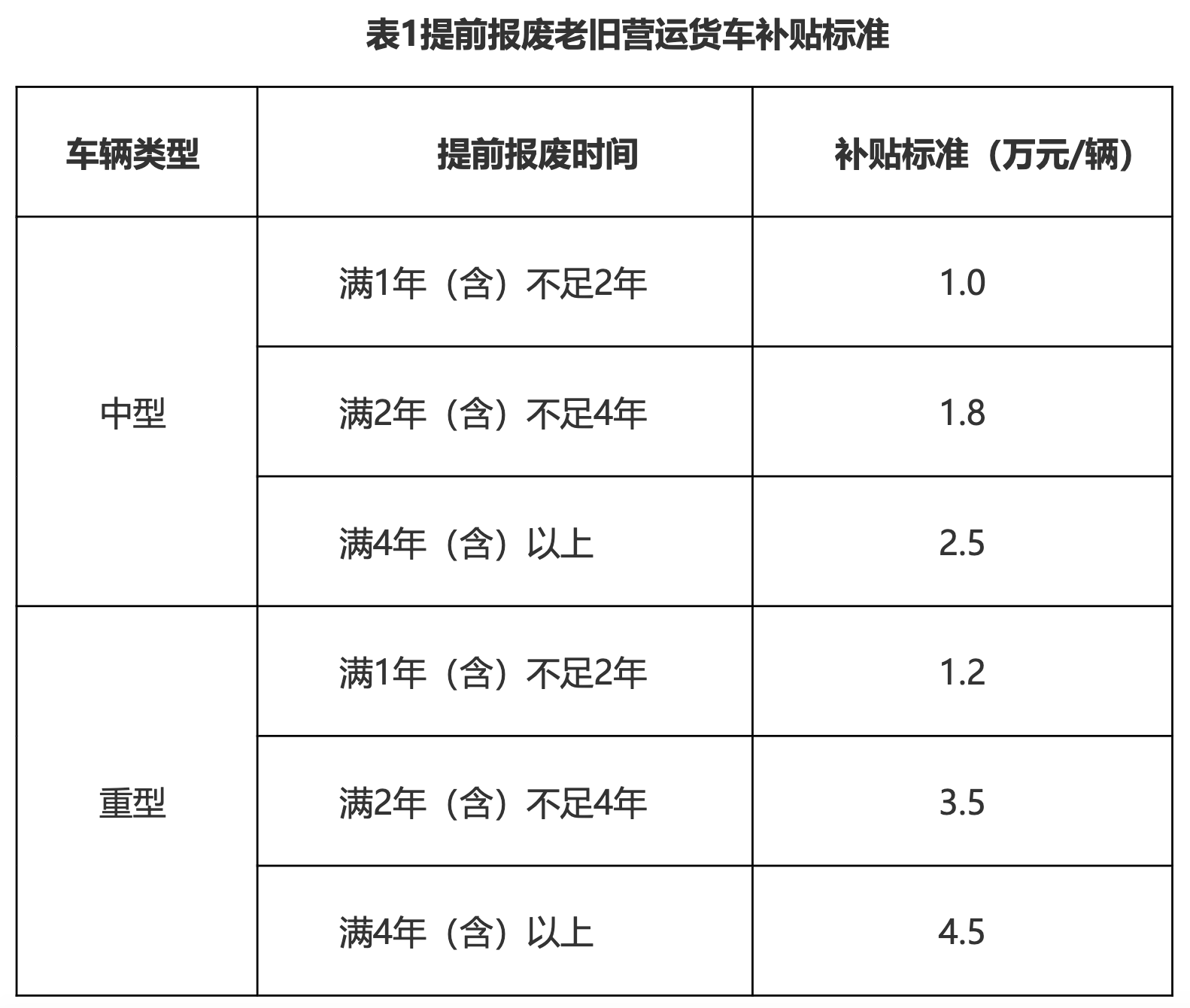 按照報廢車輛類型、提前報廢時間和新購置車輛動力類型等,實施差別化補貼標準。提前報廢老舊營運貨車及新購營運貨車補貼標準如表1、2所示,僅新購新能源城市冷鏈配送貨車補貼標準為3.5萬元/輛。報廢老舊營運貨車提前報廢時間不足1年的,可以申請新購營運貨車補貼。