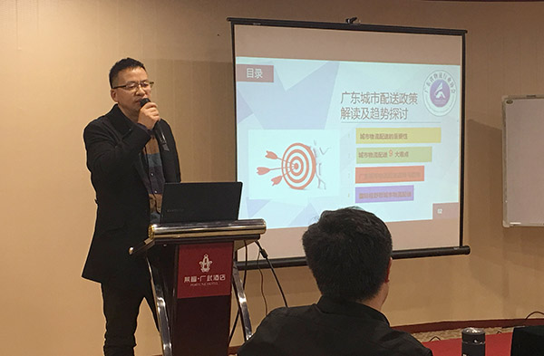 來自廣東省物流行業協會技術裝備工作委員會賀國煌主任首先作了“廣東城市配送政策解讀及趨勢探討”的主題演講,并針對城市物流配送9大難點及未來廣東在交通管制、稅費、車輛、運費等城市配送政策走向趨勢作了分析,同時對于歐、美、日國家地區對于城配的做法作了分享。