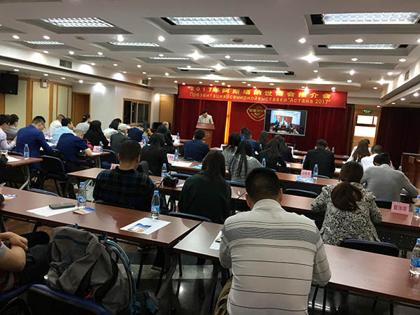 4月12日上午,2017年阿斯塔納世博會推介會在廣東省貿(mào)促會會議室召開。廣東省參與2017年阿斯塔納世博會工作領(lǐng)導小組成員單位,重點參博地市,重點參博企業(yè)以及有意向開拓哈薩克斯坦市場的商協(xié)會、企業(yè)家代表60余人參加。協(xié)會技術(shù)裝備委員會賀國煌主任攜協(xié)會海外中心譚國亮部長出席。