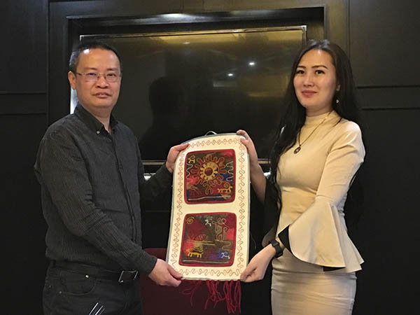 會議結(jié)束,廣東省貿(mào)促會展覽部部長蔡伊樂和哈薩克斯坦EREN集團公司董事長金恩斯·阿麗努爾、互贈友好信物紀念。